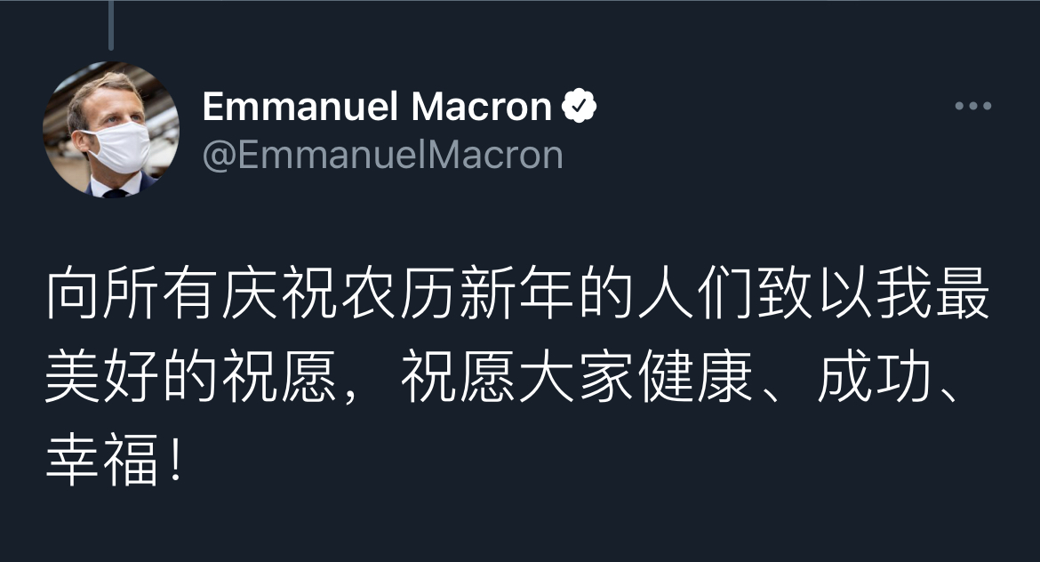 马克龙用中文写道:“向所有庆祝农历新年的人们致以我最美好的祝愿,祝愿大家健康、成功、幸福!”(总台记者 邹合义)