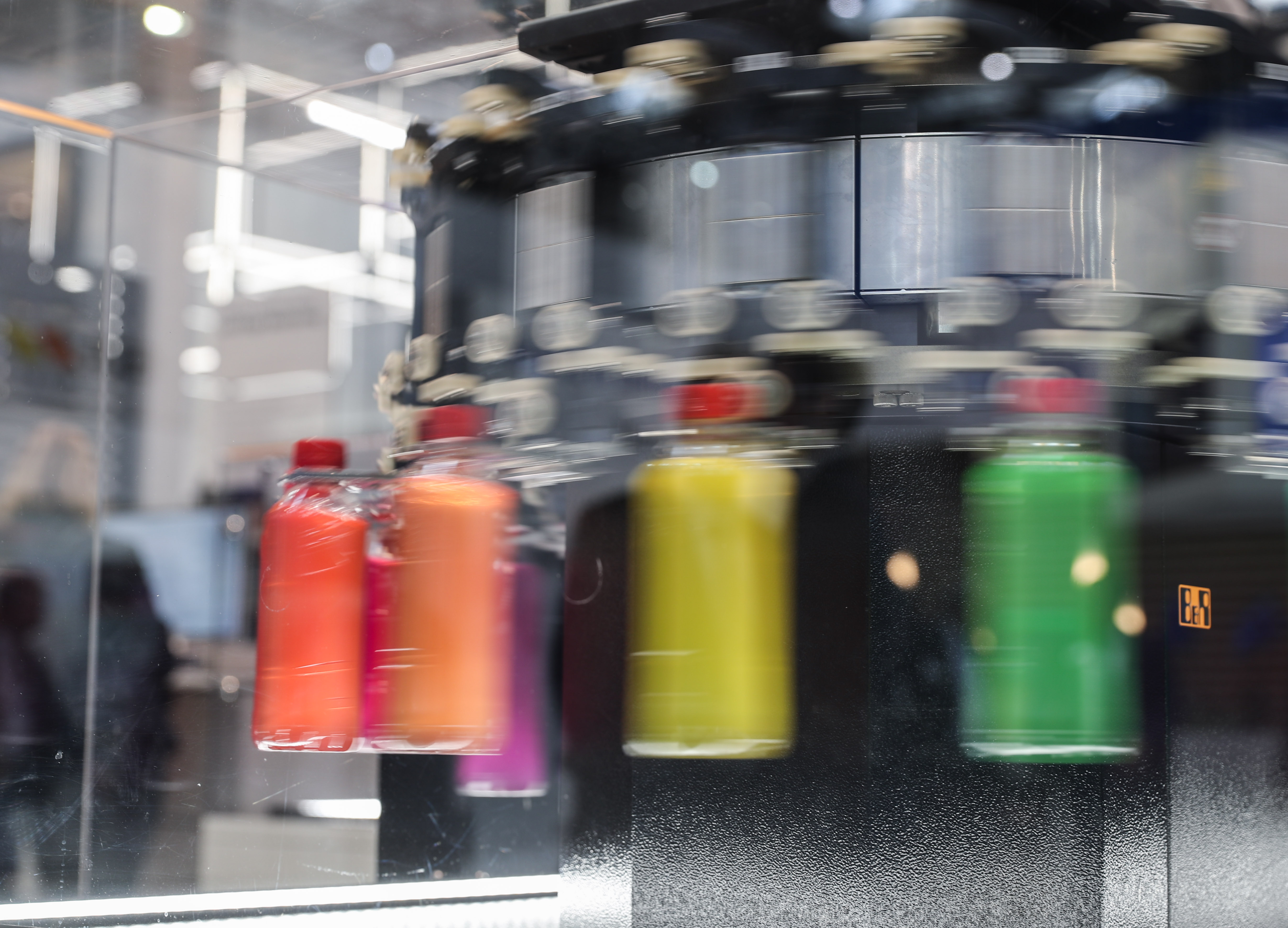 2018年4月24日在德国汉诺威工业博览会思爱普公司展区拍摄的模拟饮料装瓶作业生产线。(新华社记者单宇琦摄)