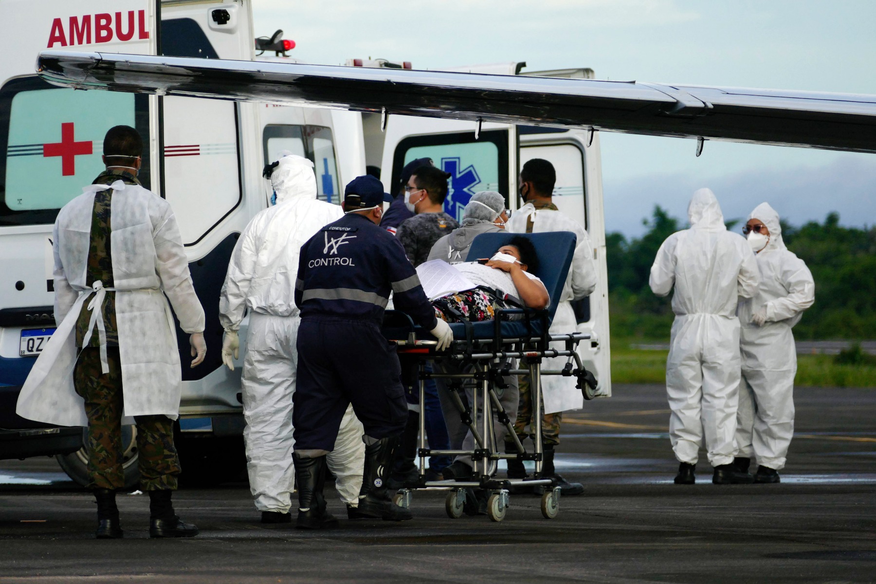 1月15日,在巴西亚马孙州首府马瑙斯,巴西空军医务人员准备将一名新冠肺炎患者送上前往外州的飞机。(新华社发,桑德罗·佩雷拉摄)