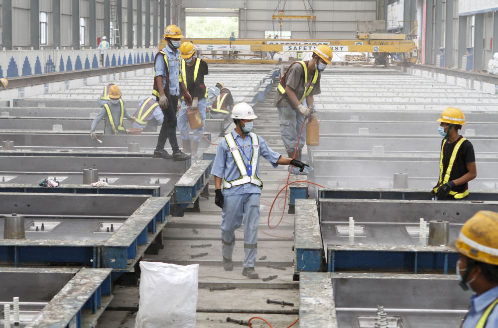 1月19日,在印度尼西亚雅万高铁轨道板预制场,中方施工人员(中)指导当地员工进行轨道板模具清理和预埋件安装。(新华社记者叶平凡摄)