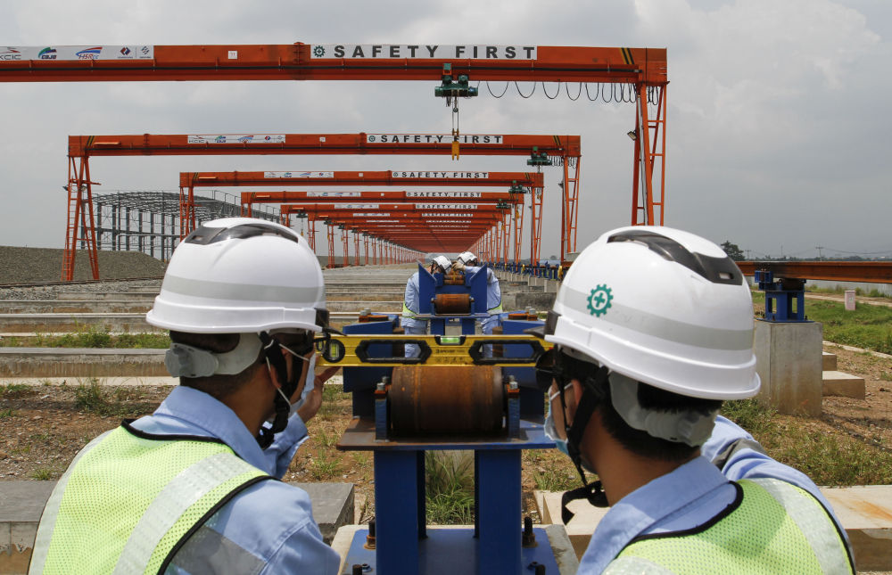 1月25日,在印度尼西亚雅万高铁铺轨基地,中方技术人员调试500米连续钢轨设备。(新华社记者叶平凡摄)