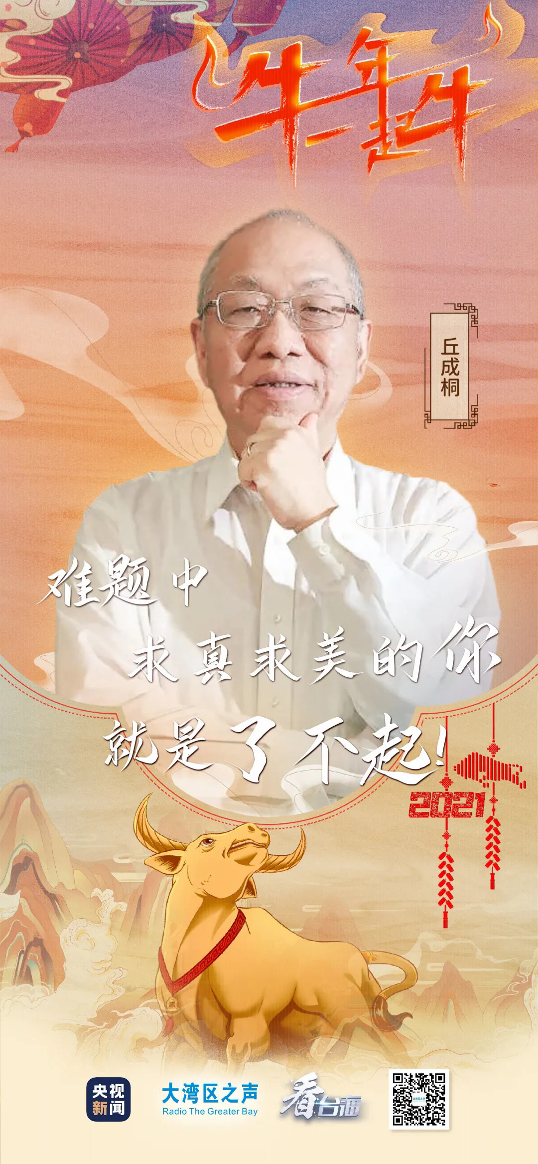 “十年树木,百年树人,我要将中国的数学从根基开始培养成为有发展潜力和创造能力的学科。这一点并不容易,从基础到前沿,从深度到成就,想要仰望天上的星空,一定要脚踏实地。“丘成桐的牛年心愿就是:”新的一年,让我们继续在解答难题中求真求美。”