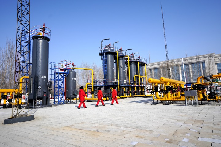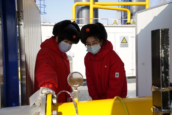 2月10日,东风计量间女子班组潘金臣(左)、杨盼盼检查调压间压力。(通联照片)