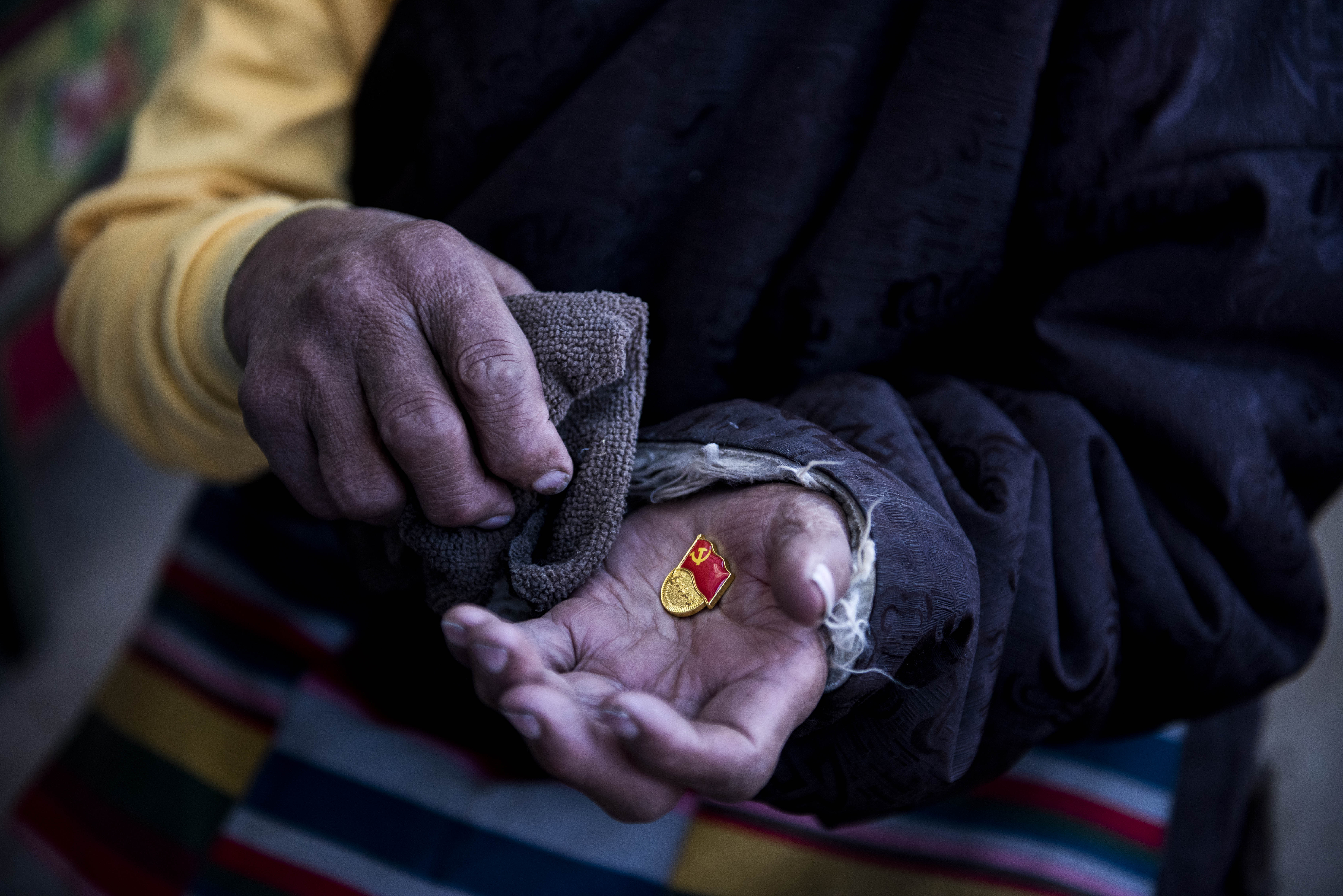 次旦老人手里握着党徽,小心擦拭(2月摄)。新华社记者格桑朗杰 摄