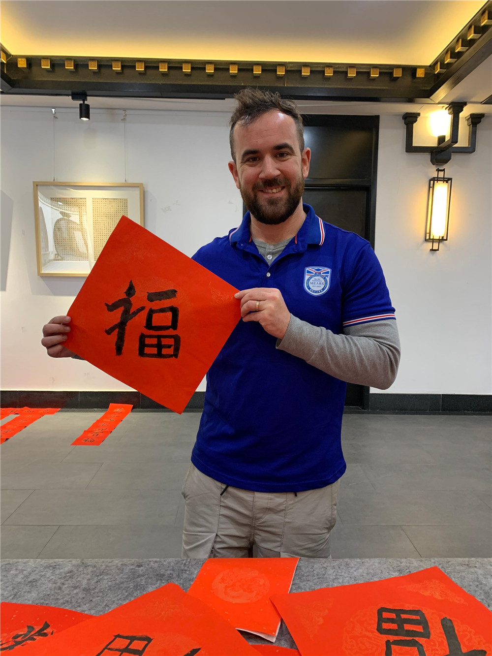 詹姆斯来自英国,在宁夏工作生活已有10年,现在供职于银川市一家英语培训机构。活动现场,他还在专业书法老师的指点下,手握毛笔,在一方红纸上一笔一划写下“福”字。