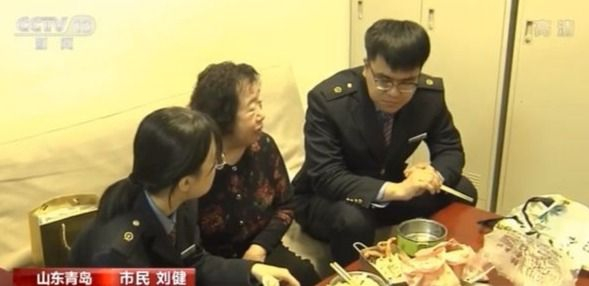 老人叫刘健,曾来窗口买过票,当时曹璐不仅热心帮助她办理了手续,还留了联系方式,一来二去就成了朋友。听说今年曹璐夫妻俩不能回家过年了,刘健就包了饺子,带着几样菜来到售票厅看望曹璐。