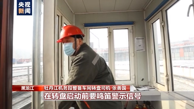 牡丹江机务段整备车间转盘司机 张善国:在转盘启动前要鸣笛警示信号,然后1档启动,在正常启动过程中,如果速度感觉起来了,就可以加入2档或者是3档。