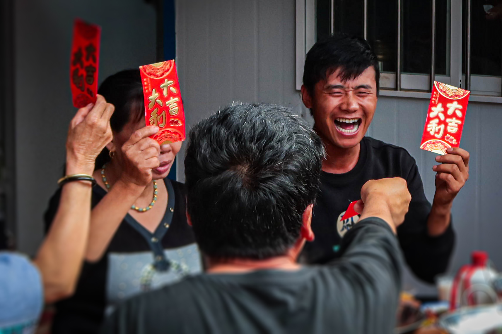 2月11日,工友们在团圆饭桌上领到公司派发的新年红包。新华社记者张鑫超摄