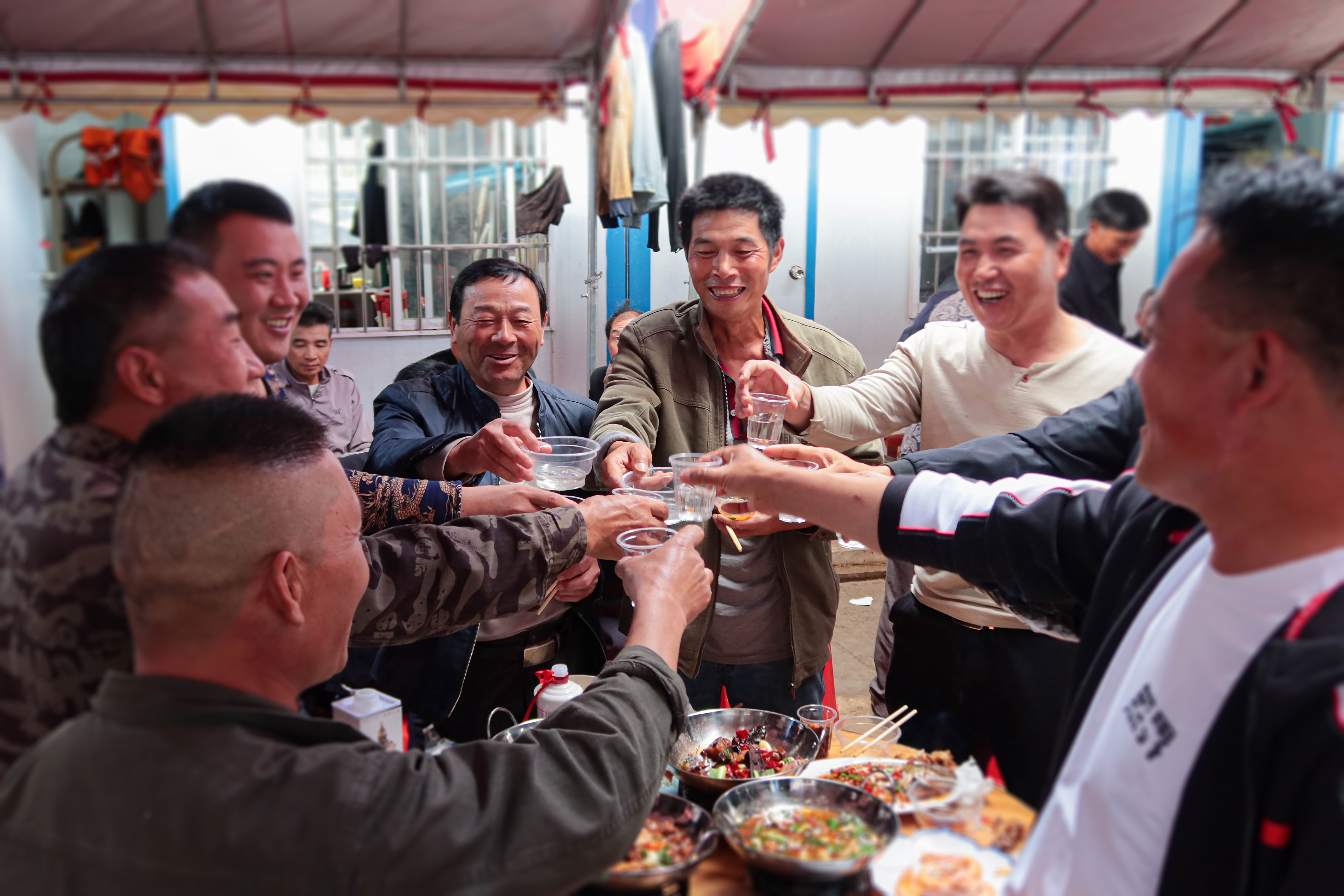 2月11日,来自不同地方的工友们欢聚一堂,举杯同庆新年的到来。新华社记者张鑫超摄