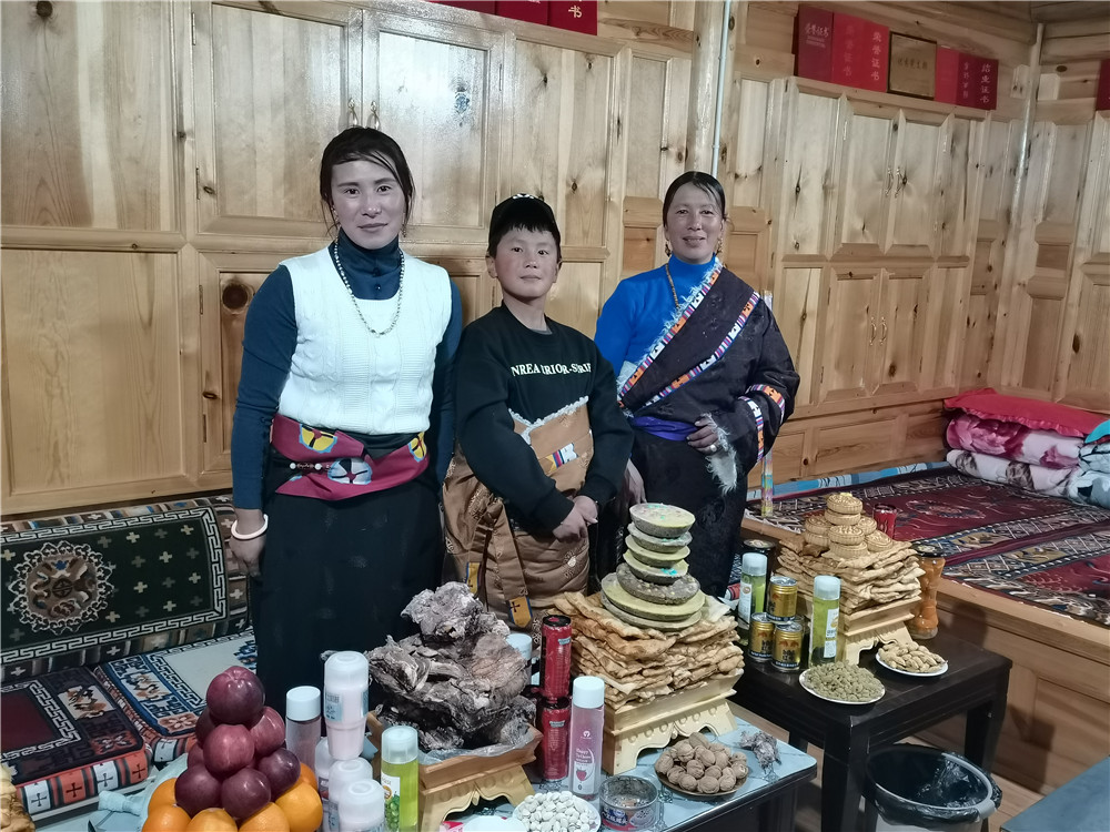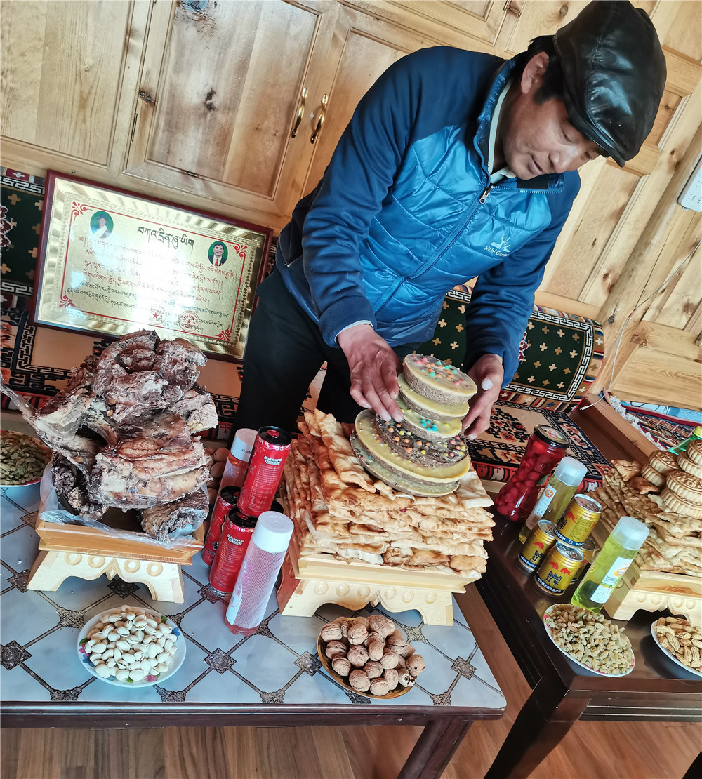 晚上,南卡尖措家的木桌上摆满了水果和藏式点心,各类饮料也被垒成塔状,五颜六色,十分喜庆。“除了准备家里的美食,我们还要给负责放牧的女婿准备点心、牛肉和糖果,不能让他空手出门。”南卡尖措笑着说。