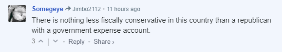 还有网民指出,在这个国家,没有什么比一个拥有政府开支账户的共和党人更开放的了。↓