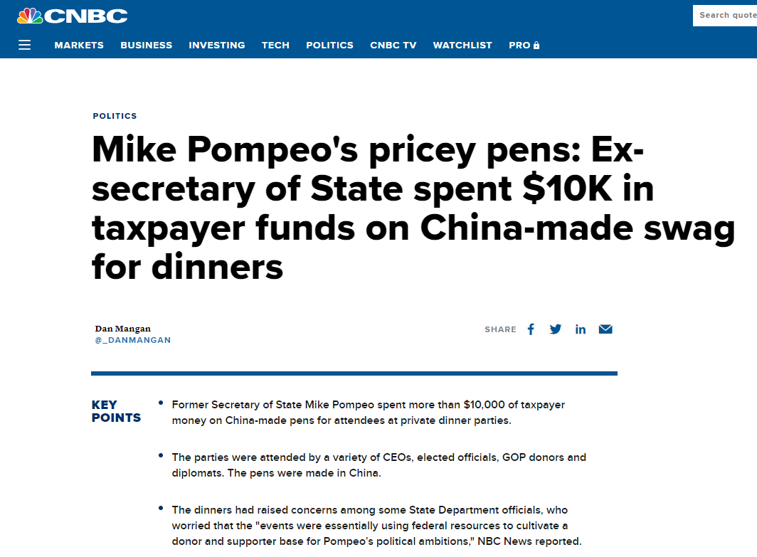 美国消费者新闻与商业频道(CNBC)2月11日再次曝料,美国前国务卿迈克·蓬佩奥(Mike Pompeo)公开抨击中国的同时,背地里却使用美国纳税人的钱购买中国制造的钢笔,提供给私人晚宴的与会者做伴手礼。
