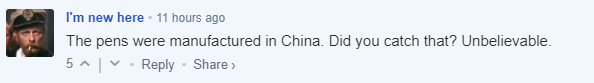 有网民直呼:这些钢笔产自中国,注意到了吗?简直难以置信。↓