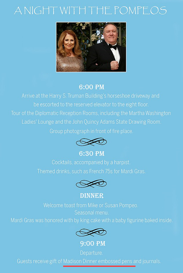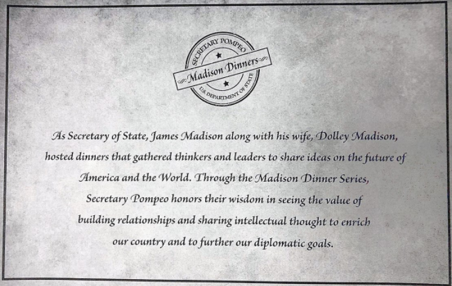 美国媒体此前披露,蓬佩奥自2018年被任命为国务卿以后,多次举办私人晚宴,并命名为“麦迪逊晚宴”,因为美国第四任总统、第五任国务卿詹姆斯·麦迪逊有邀请外国外交官在晚宴上交流想法的习惯。蓬佩奥的私人晚宴主要邀请商业大亨,保守派媒体人士以及共和党捐助者等人士出席,只有14%的受邀者是外交官或外国官员。