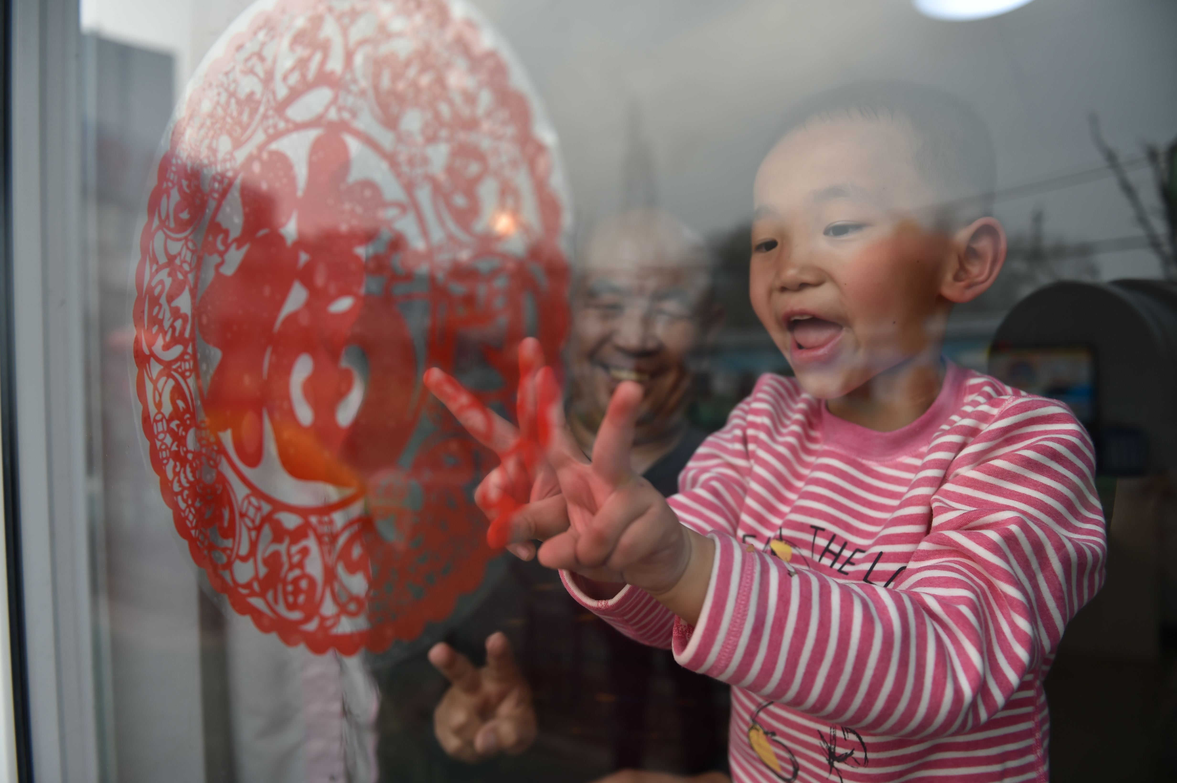 活泼爱笑的小茂和爸爸一起贴春联,还自己在窗户玻璃上贴了一个大大的“福”字。