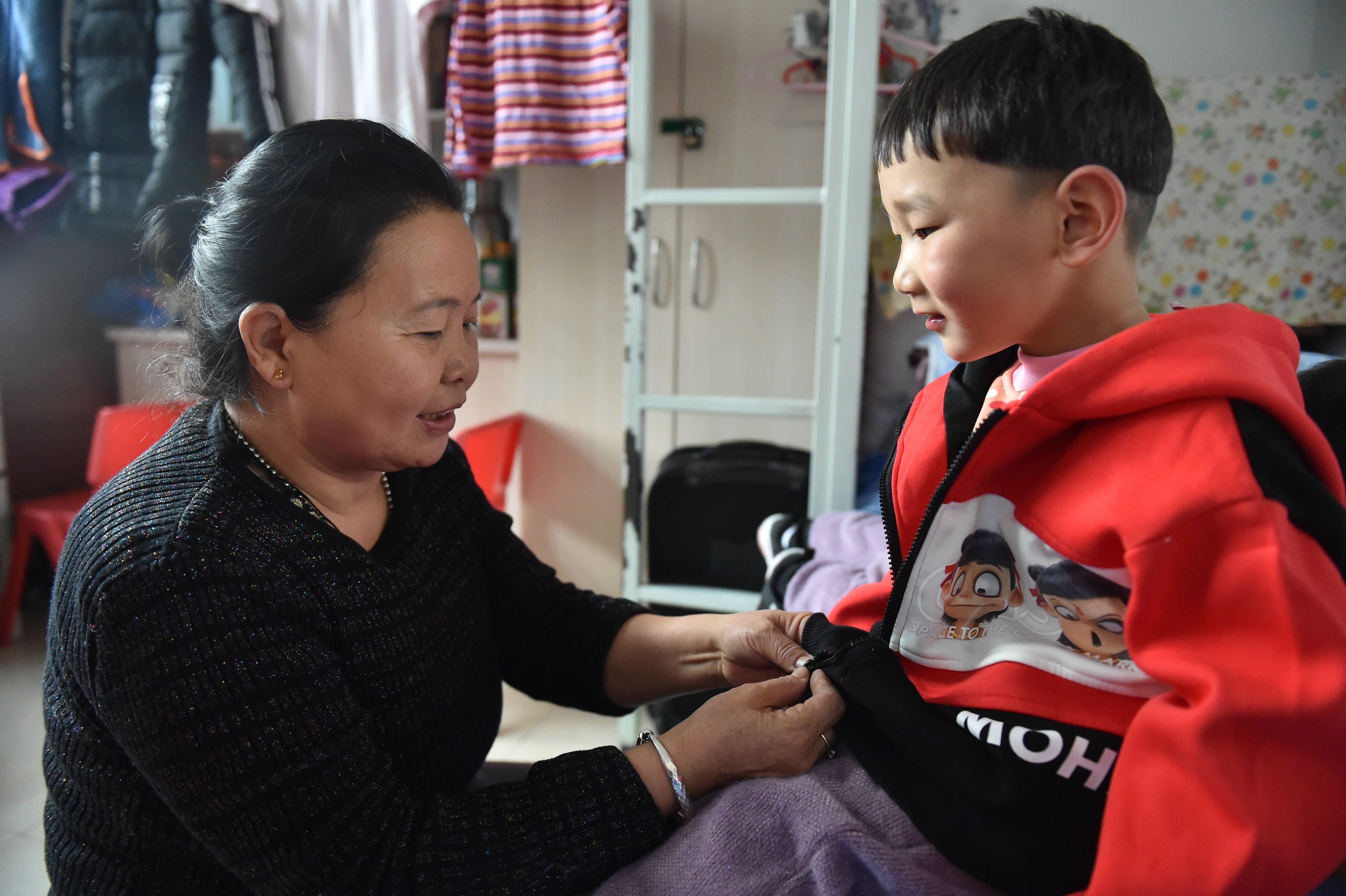 2月11日,邢梅英正在给孩子穿新衣服。(新华社记者柴婷摄)