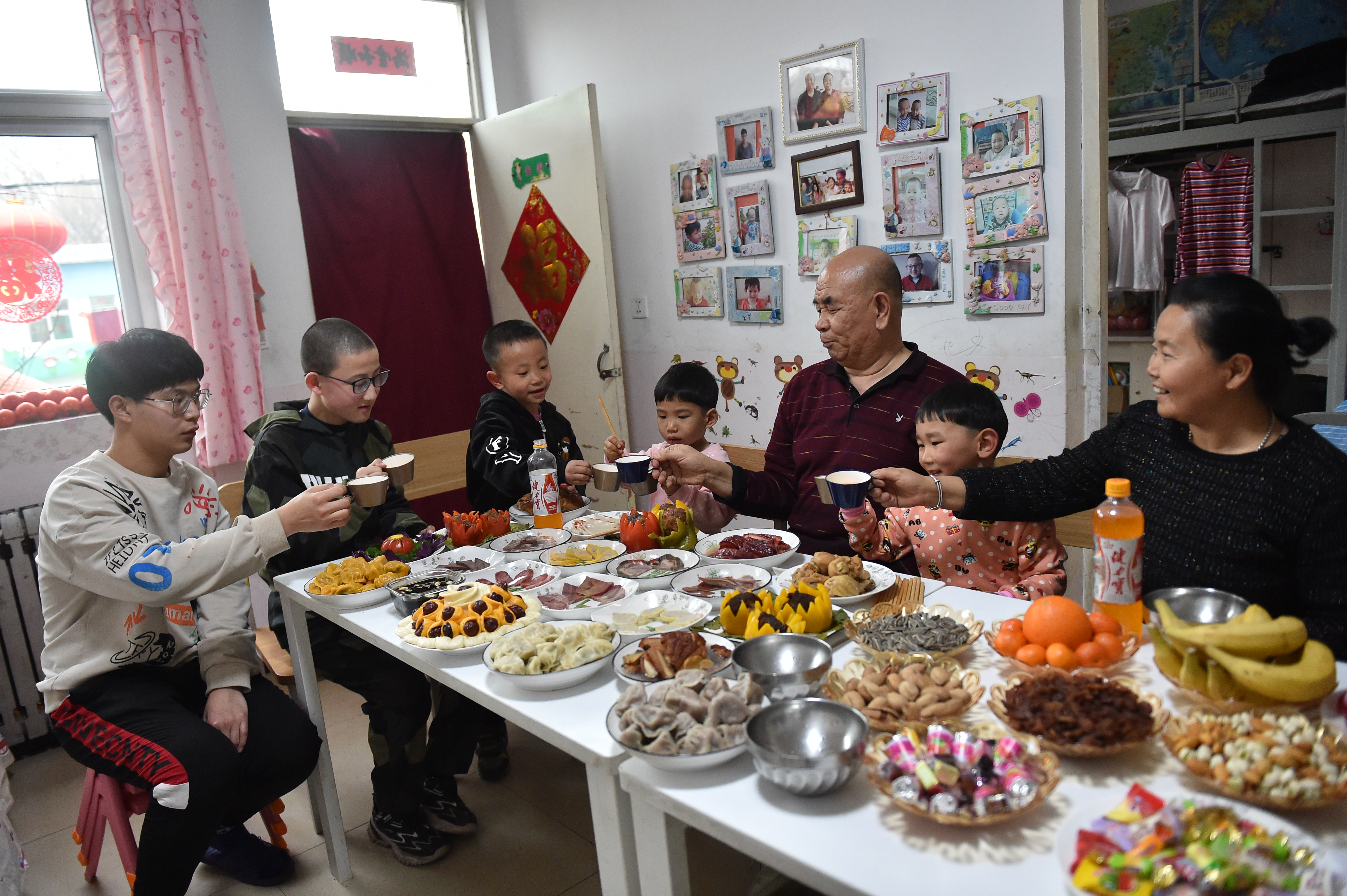 2月11日,在太原市社会(儿童)福利院的“安家”,邢梅英和王贵忠一家人一起吃年夜饭。(新华社记者柴婷摄)