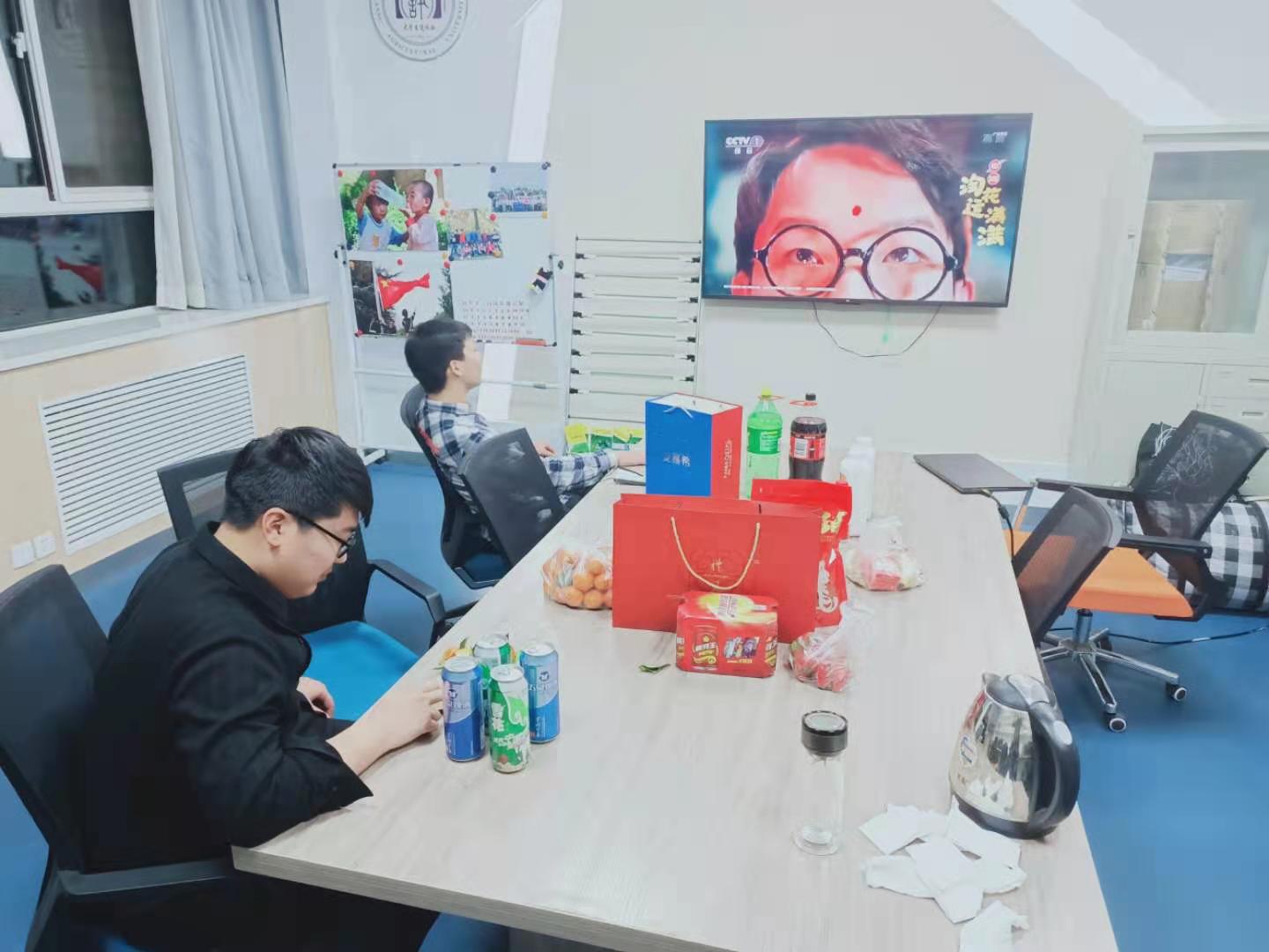 苌烁森(右)与其他留校同学在学院办公室看春晚。受访者供图