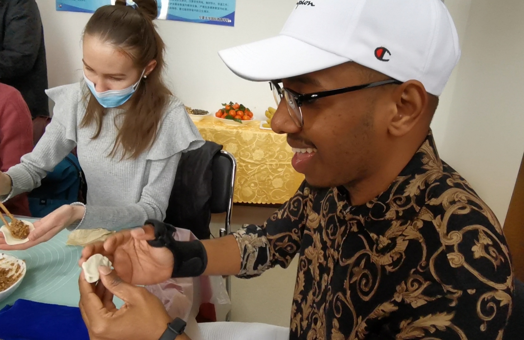 来自印度洋岛国科摩罗的萨尼第一次尝试包饺子。在喜庆的新春氛围中,中外师生围坐在一张长桌上。萨尼模仿老师的样子,挖了一勺肉馅放在圆形的饺子皮上,将封口捏成漂亮整齐的花边。