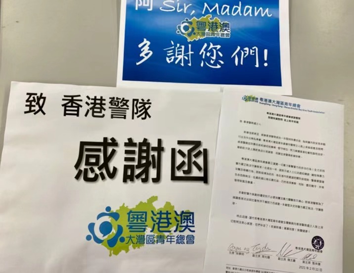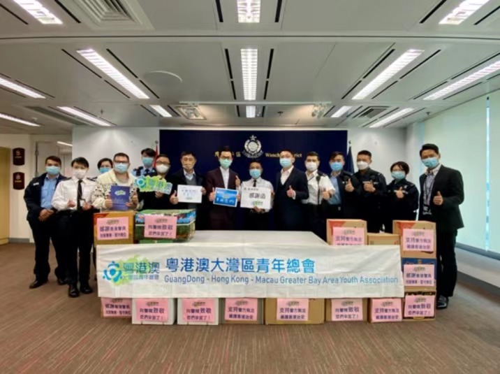 2月11日除夕夜,粤港澳大湾区青年总会到访港岛区湾仔警署,感谢香港警队过去一年坚持防暴抗疫、为保护市民安危作出的贡献,向警队致赠应节食品以表谢意,祝愿全港警员新春快乐。