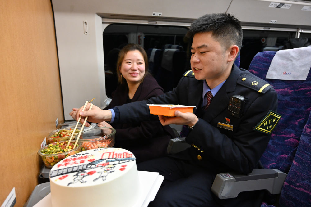 今年过年唐忠洪又是在值乘中度过新年,在家休息的妻子周靖云为丈夫准备了一份惊喜,带上他喜欢的菜品,今年除夕,唐忠洪又要在值乘中度过。腊月二十九,周靖云为他亲手制作了蛋糕和菜品,两人在列车上提前吃了团圆饭。