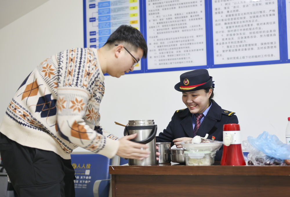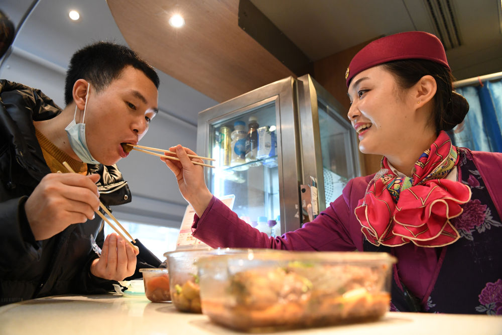 重庆客运段列车长余源在除夕当天为妻子徐婧婧做了一顿“年夜饭”。余源和徐婧婧2013年相恋于同一所学校,2014年大学毕业后,两人都进入了成都铁路局,2020年9月,余源和徐婧婧领了结婚证。