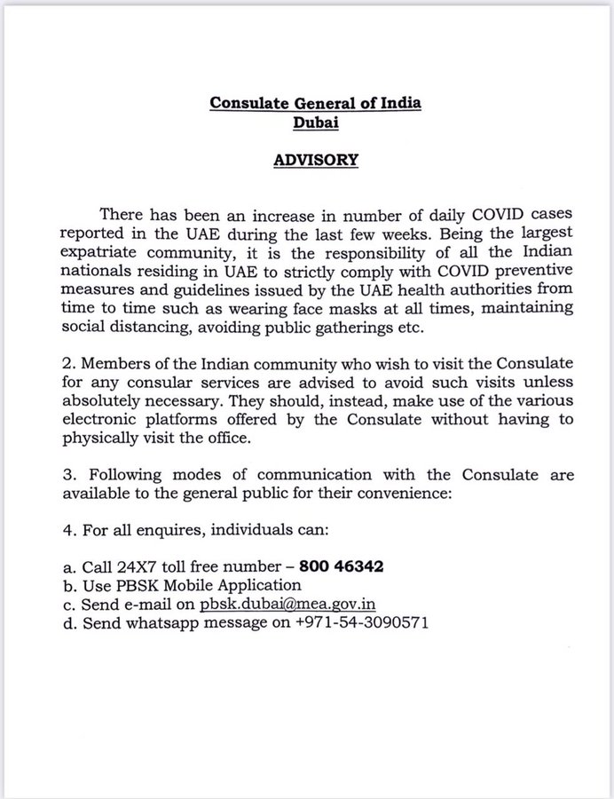 印度驻迪拜领事馆在通告中还表示,由于阿联酋最近几周新冠肺炎确诊病例数量连续上升,领事馆呼吁在阿联酋的印度公民遵守各种预防规定,例如避免聚会、戴口罩和保持社交距离等。
