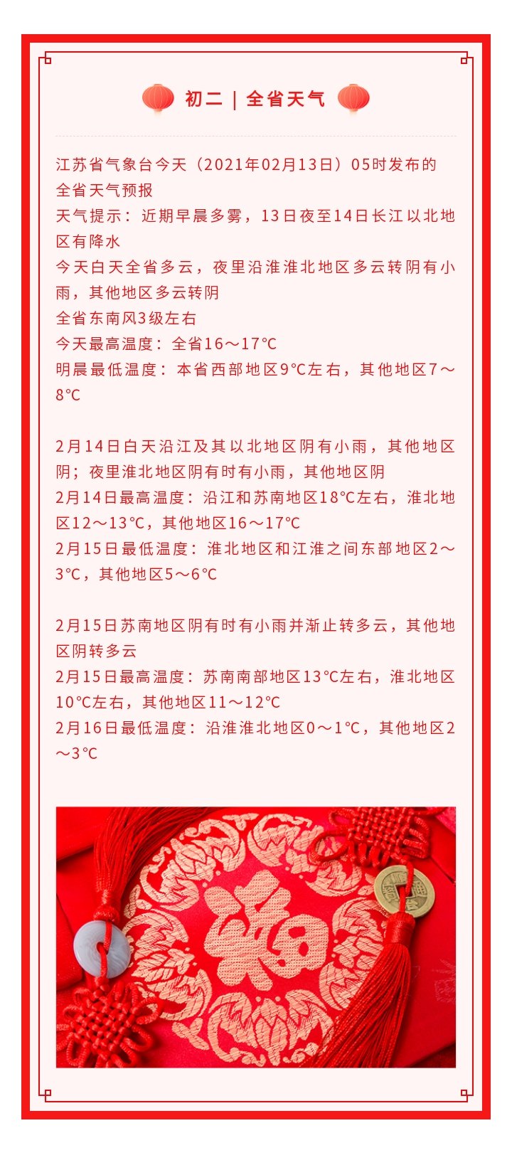 据江苏省气象台发布:今天(13日)白天江苏全省多云,夜里沿淮淮北地区多云转阴有小雨,其他地区多云转阴;全省东南风3级左右;今天最高温度:全省16~17℃;明晨最低温度:本省西部地区9℃左右,其他地区7~8℃。(总台央视记者 吴睿)