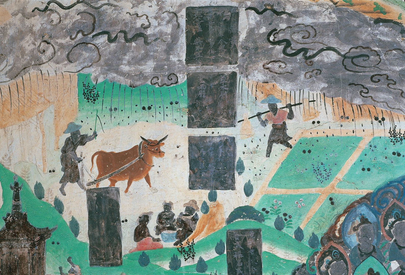 农夫挥鞭、黄牛犁地,莫高窟第23窟的雨中耕作图描绘出唐代的农耕生活。在第445窟的壁画中,牛犁地用的是当时先进的生产农具曲辕犁。