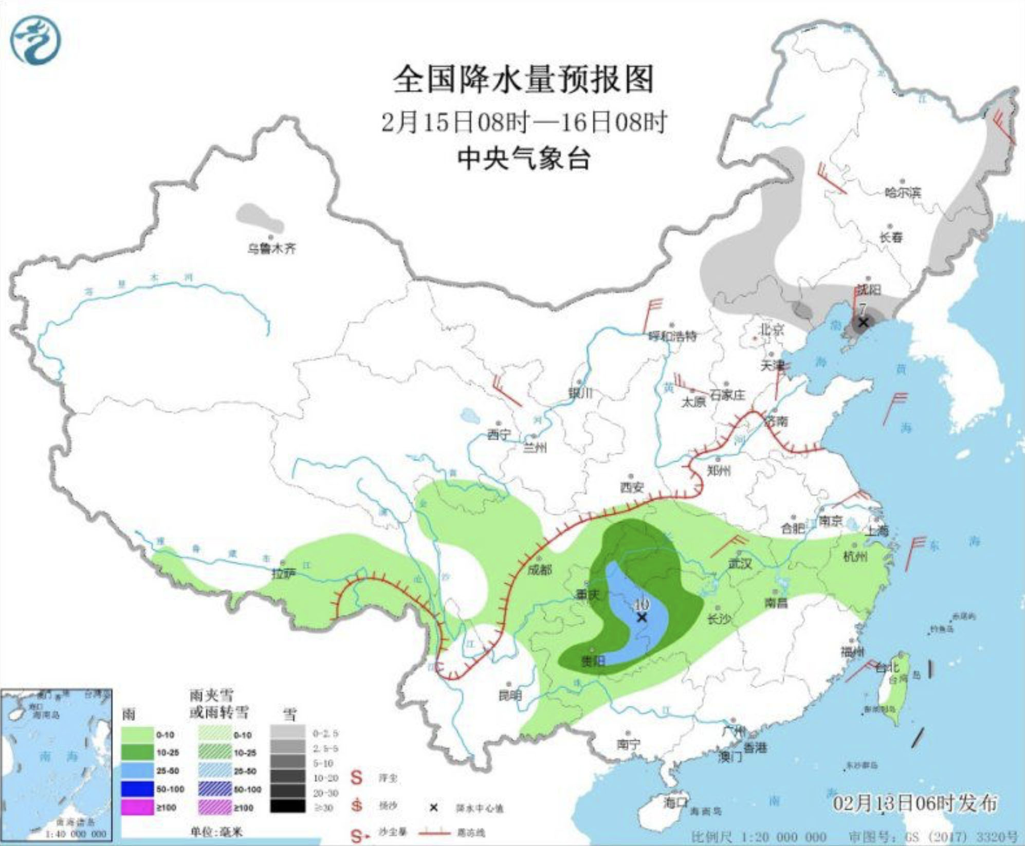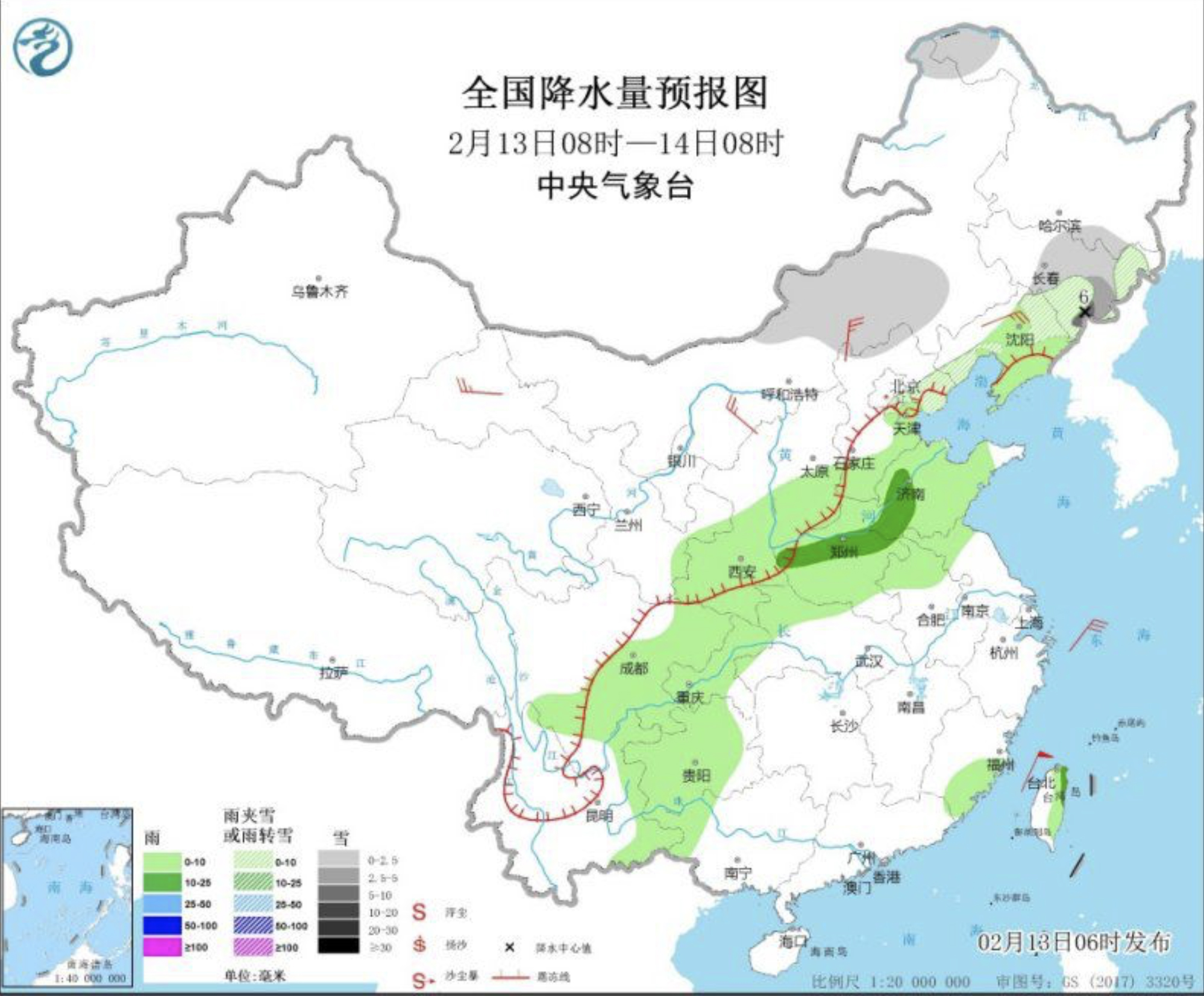 △全国降水量预报图(2月13日08时—14日08时)