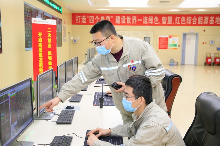 2月11日,内蒙古大唐国际托克托发电有限责任公司发电部运行副值长禹志刚(左一),在指导机组参数调整。(受访者供图)