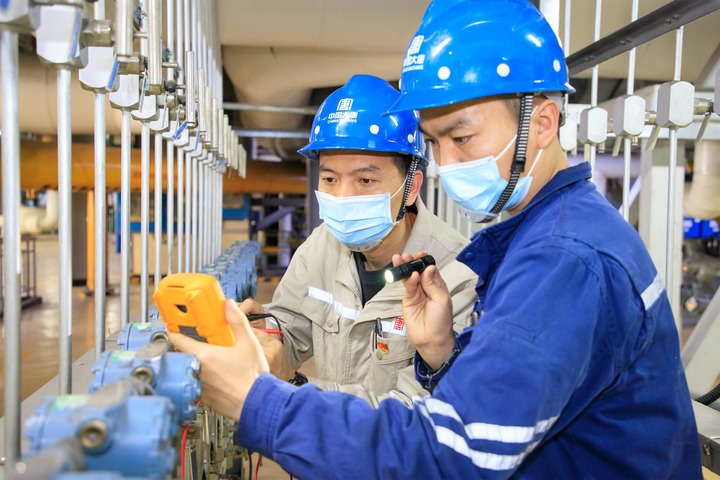 2月11日,内蒙古大唐国际托克托发电有限责任公司设备部热控车间专工陈兆晋(左二),在测量变送器工作状态。(受访者供图)