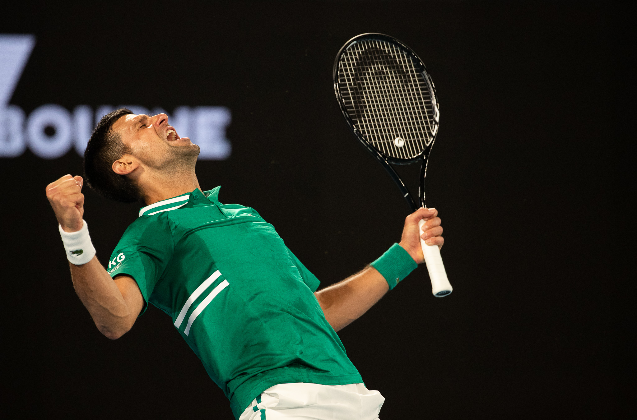 2月12日,在墨尔本进行的澳大利亚网球公开赛男单第三轮比赛中,塞尔维亚选手焦科维奇以3比2战胜美国选手弗里茨,晋级下一轮。图为焦科维奇在比赛后庆祝晋级。(新华社发,胡泾辰摄)