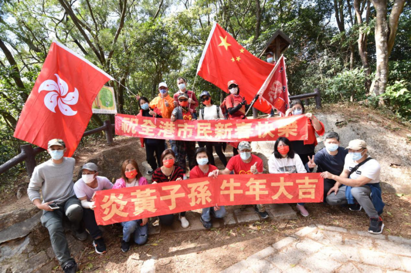 春节期间,香港多个团体以不同形式向香港市民和祖国人民拜年。2月12日,大年初一清晨,十几位香港市民登上狮子山顶,手举国旗和区旗,拉起横幅向香港市民和祖国人民拜年,祝愿在新的一年中,香港战胜疫情,恢复经济发展,祝愿国家更加繁荣稳定,国泰民安。(总台记者 金东)