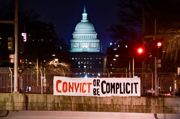 2月9日,在美国参议院对特朗普第二次弹劾审判的第一天,国会大厦旁的一座桥上挂出一条横幅,上书“判其有罪或与其同谋”。(路透社)