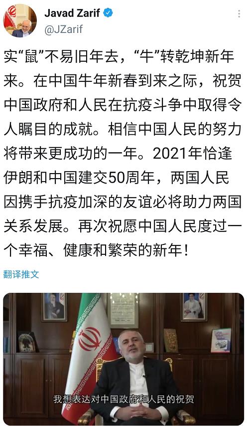 日前,伊朗外长扎里夫通过视频和在社交媒体上贴出谐音“春联”,向中国政府和人民表达牛年新春的祝福。