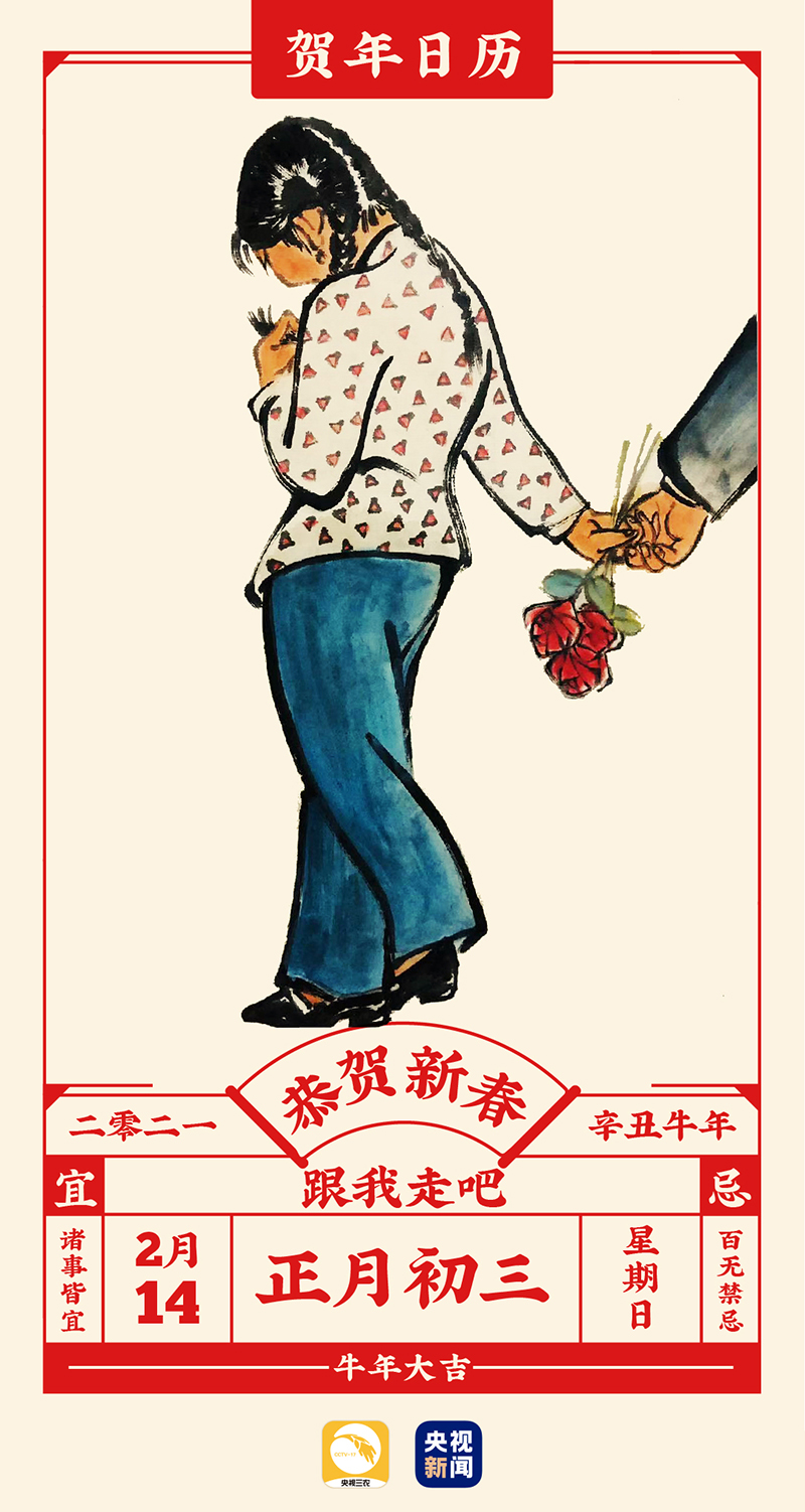 《跟我走吧》,2021辛丑牛年正月初三恰逢2月14日情人节,以一幅情侣牵手的场景,表现了女孩儿的羞涩与男孩儿的浪漫。