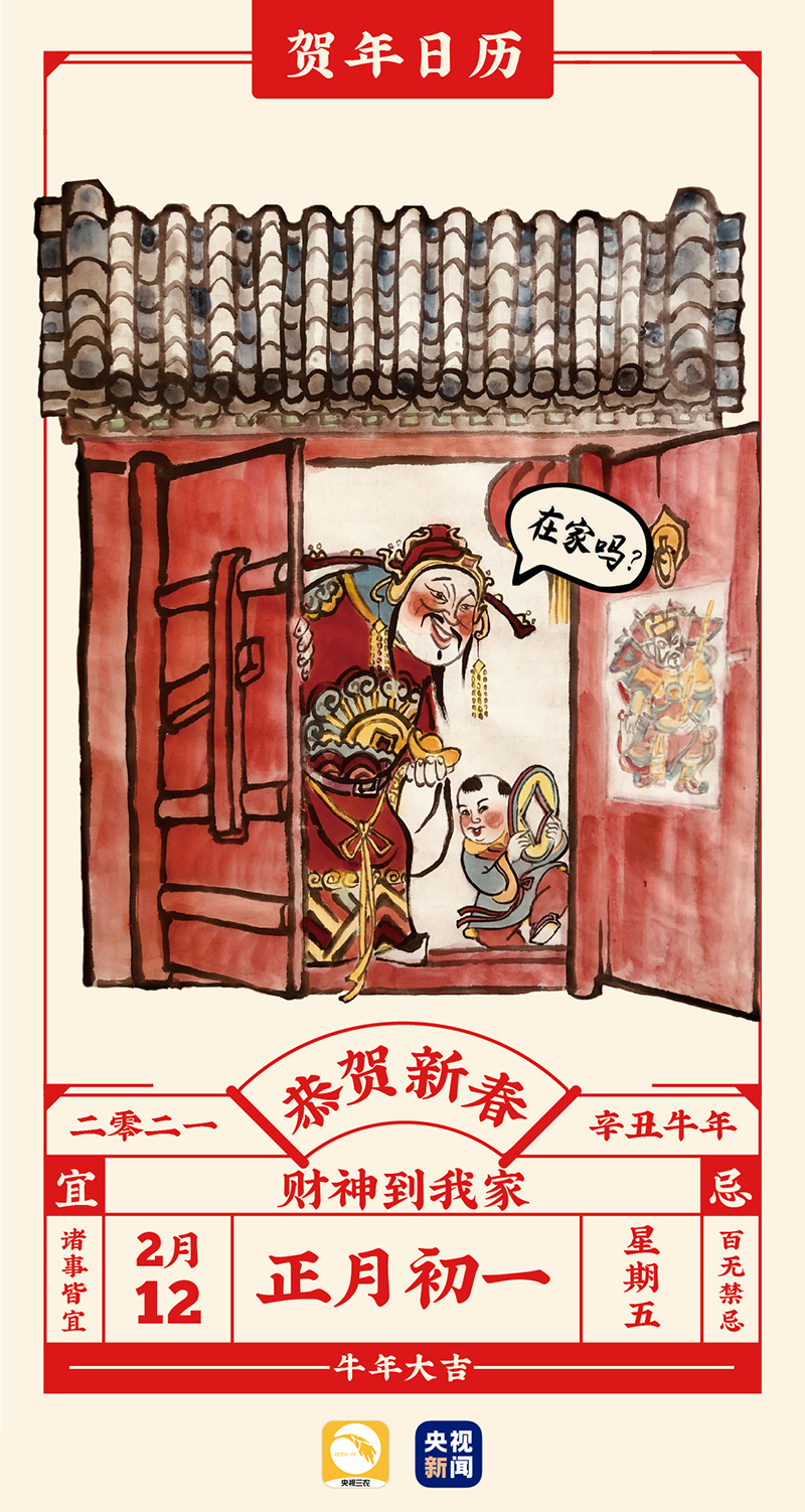 《财神到我家》表现了财神手拿元宝、推开院门来到家里拜年的场景。大年初一,辞旧迎新,拜贺新年。