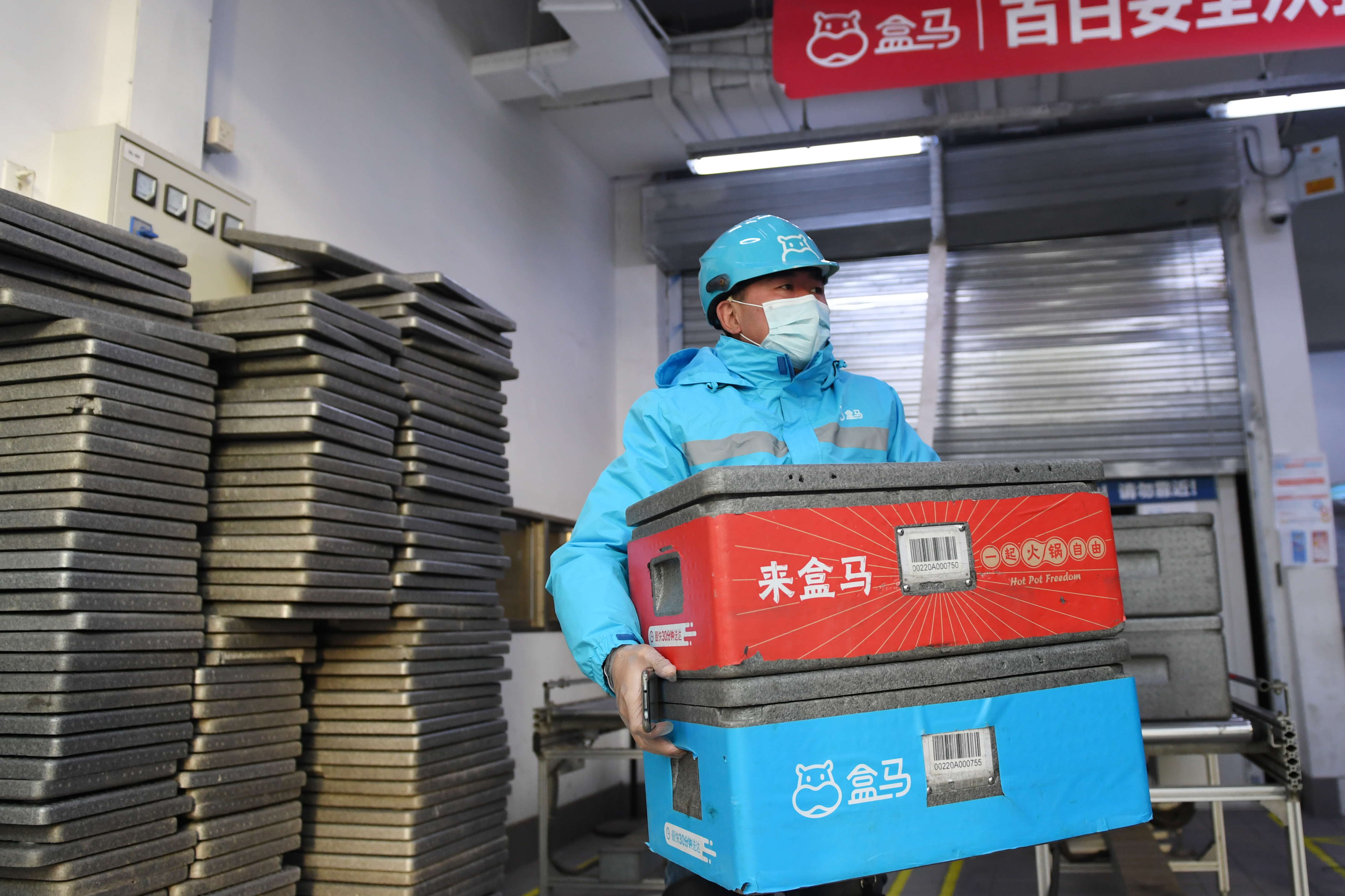 2月5日,盒马鲜生枣园店配送员刘树才在搬运需要配送的商品。新华社记者 鞠焕宗 摄