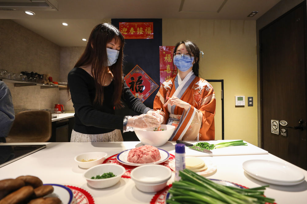 2月6日,在日本东京,参与者在“留日学子在线春节联欢晚会”的直播现场包饺子,通过直播庆祝即将到来的新年。(新华社记者杜潇逸摄)