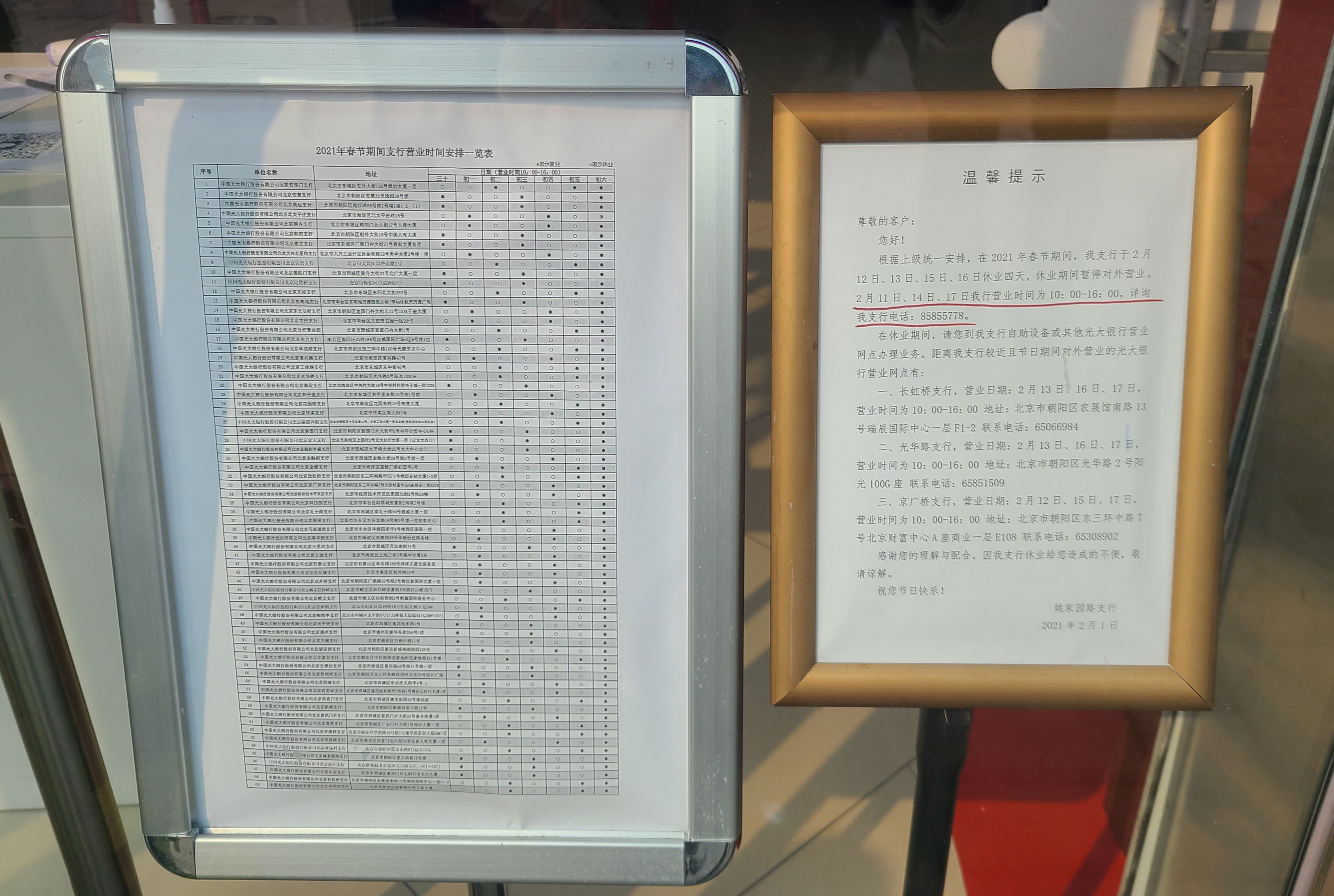 据了解,为保证线下服务“在线”,春节期间银行多采用网点交错开业制度,就近网点轮流营业,保证服务半径内合理数量的网点开门营业。