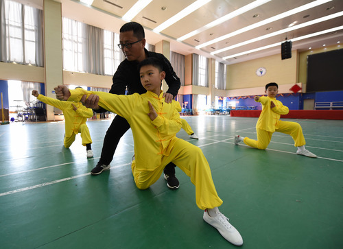 合肥市一六八玫瑰园学校武术社团的学生在教练指导下练习武术。(新华社记者周牧 摄)