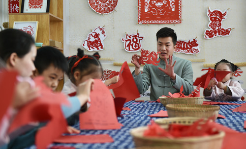 河南洛阳市孟津县第二县直幼儿园让小朋友们感受传统剪纸艺术魅力。 新华社发(黄政伟 摄)