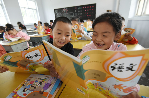 河北邯郸复兴区康庄中心小学一年级新生阅读语文部编教材。新华社发(郝群英 摄)