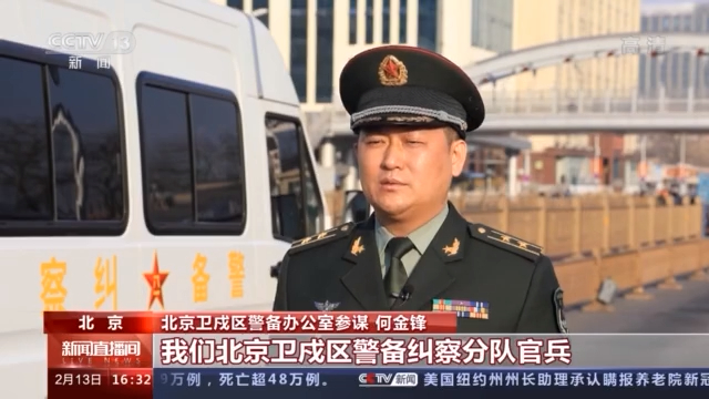 北京卫戍区警备办公室参谋 何金锋:我们北京卫戍区警备纠察分队官兵积极发挥执法服务职能,春节期间,主要对市区交通枢纽、进出京主要道路,持续开展警备纠察任务,维护军队形象、军人形象。