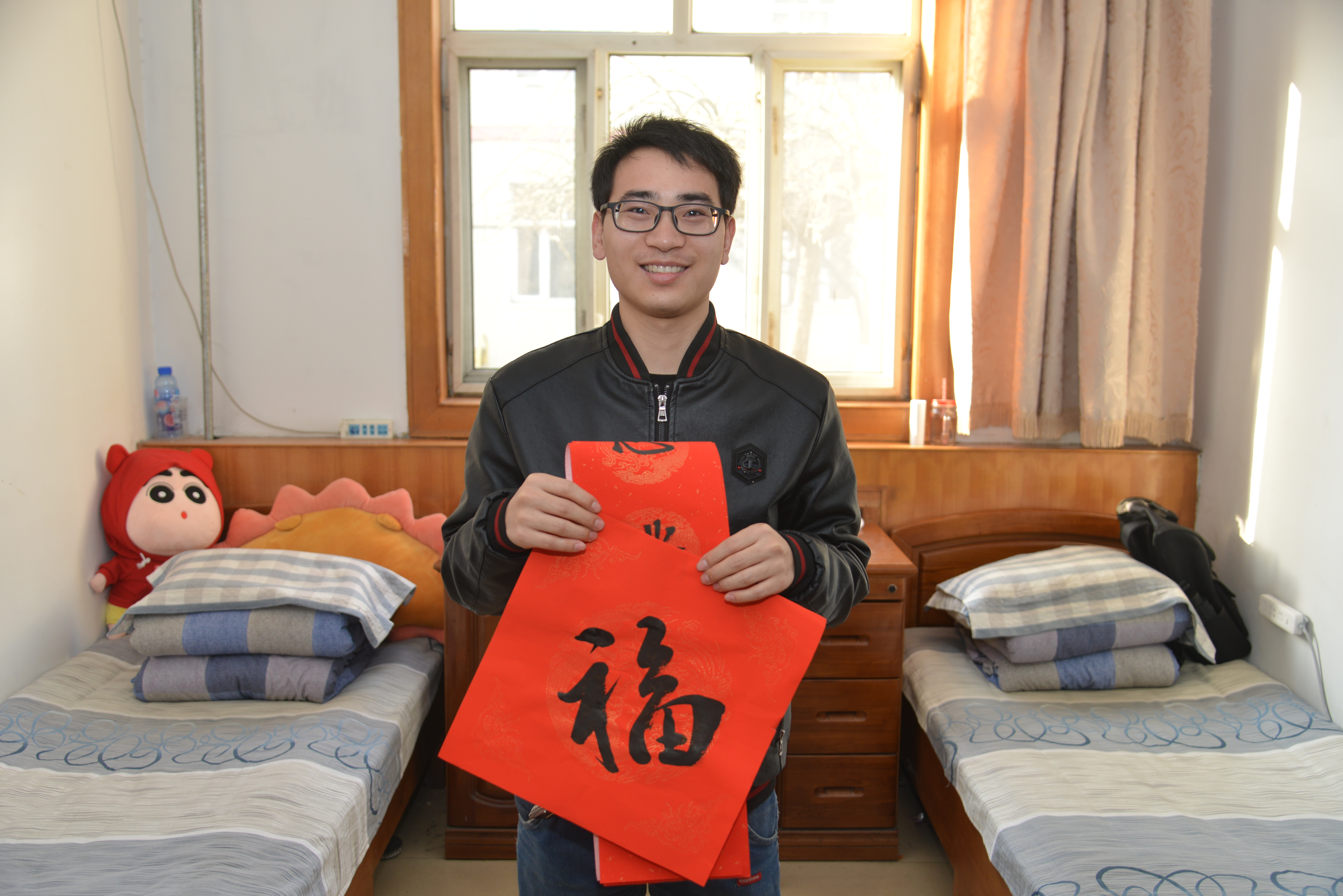2月5日,鞠召庆准备把福字和对联贴在宿舍。(图片由开滦集团提供)