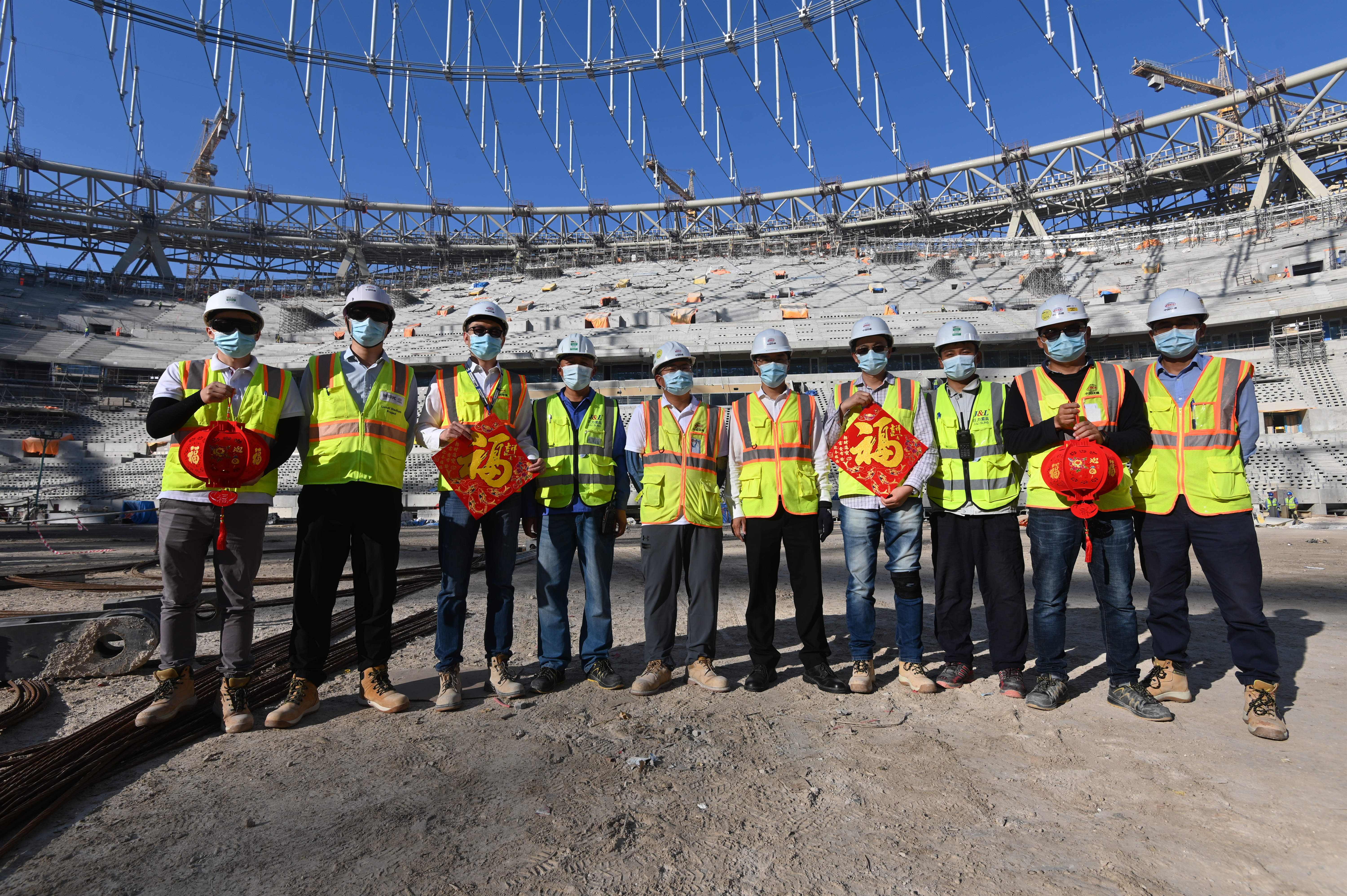 2021年农历新春,在中国建设者的统筹主导下,来自全球15个国家的110家大型分包企业,4600多名建设者共同协作,顺利完成了可同时满足国际足联、欧美规范和卡塔尔当地规范的世界杯主体育场重要工程节点,为全球献上了中国新春的牛年大礼。