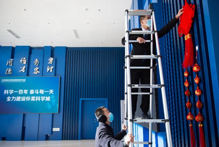 春节前夕,怀柔科学城中国科学院物理所怀柔园区工作人员在布置春节装饰。(新华社记者 陈钟昊 2月3日摄)