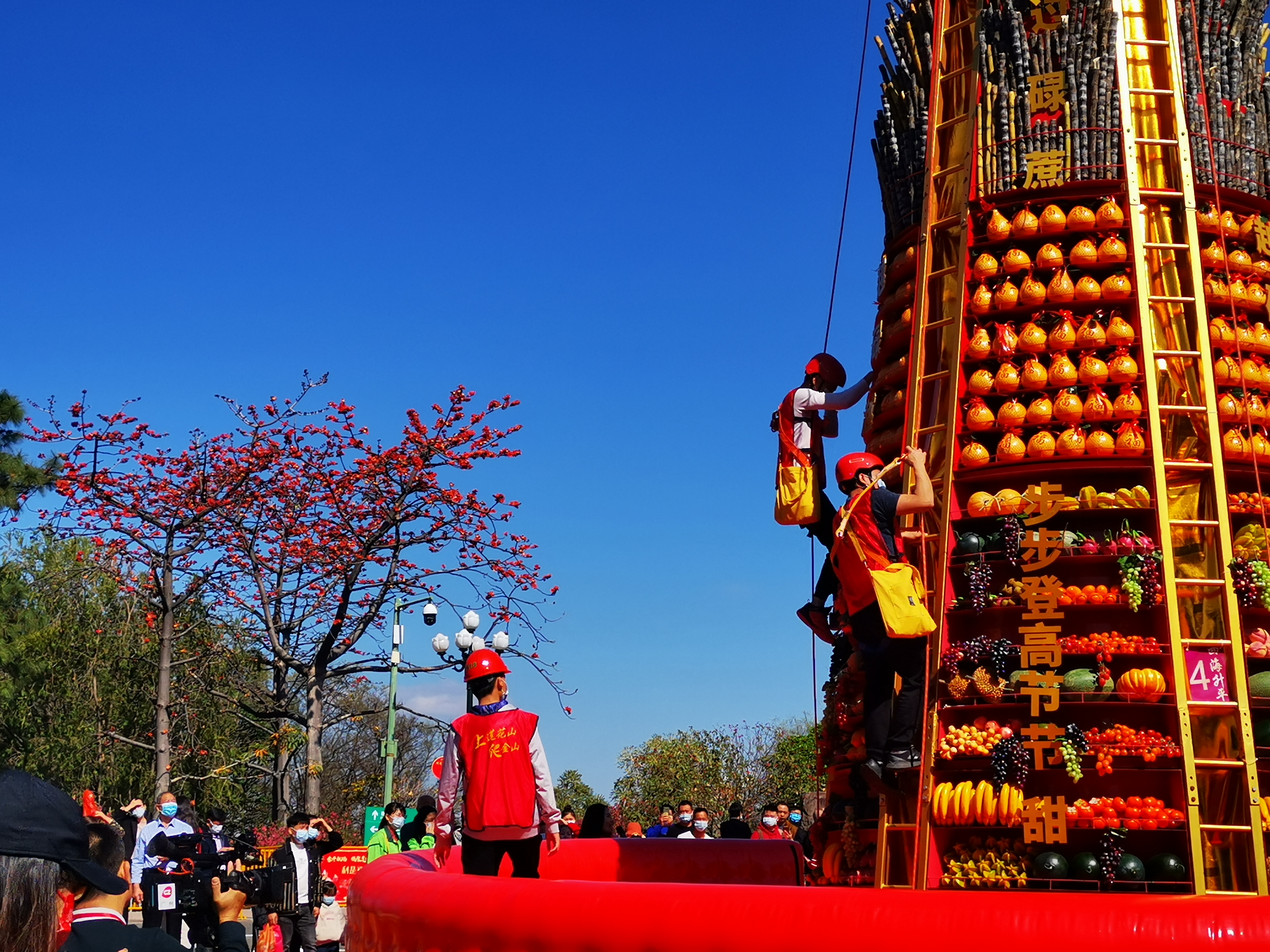 在“爬金山大奖赛”场地上,不时传出叫好声。高16米的“金山”上堆砌着各种独具寓意的蔬果:平平安安的苹果、金银满屋的柑橘、心想事成的橙子、节节高升的甘蔗。很多市民摩拳擦掌,报名参赛。