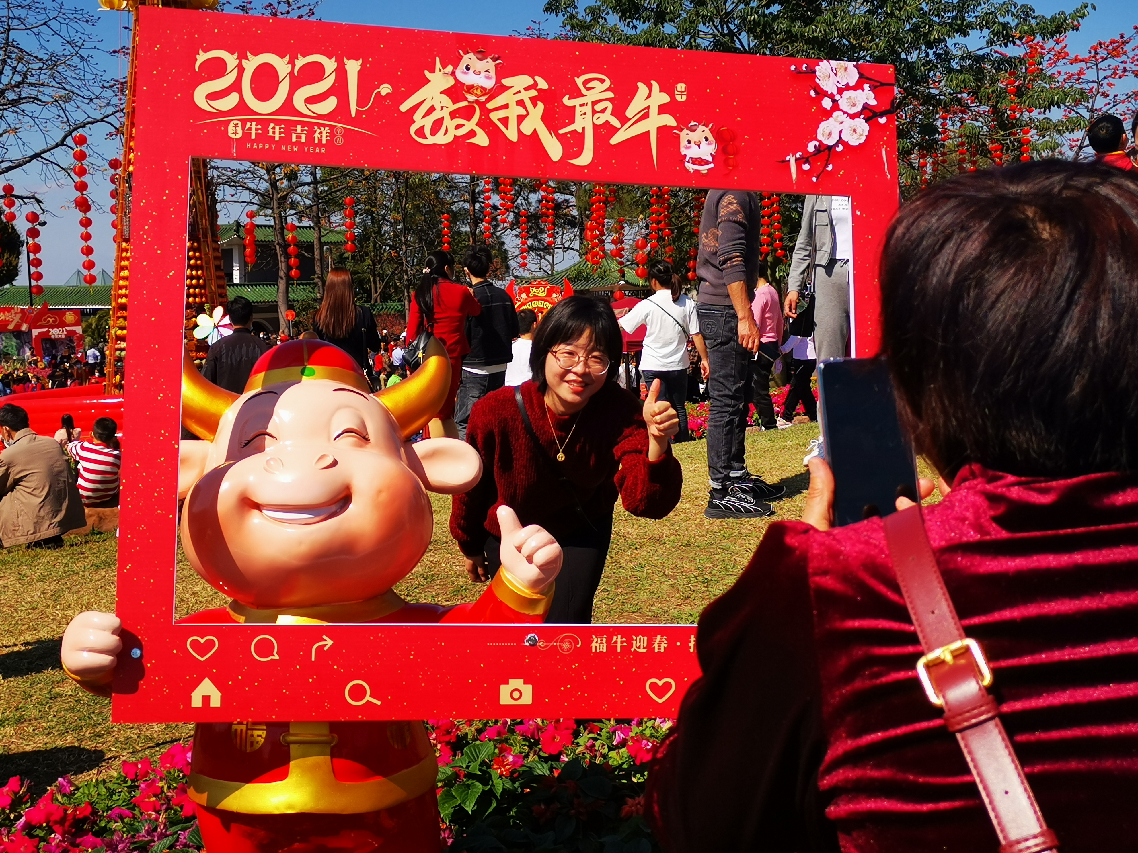 ↑市民在金牛贺岁的相框前拍照。新华社记者田建川摄